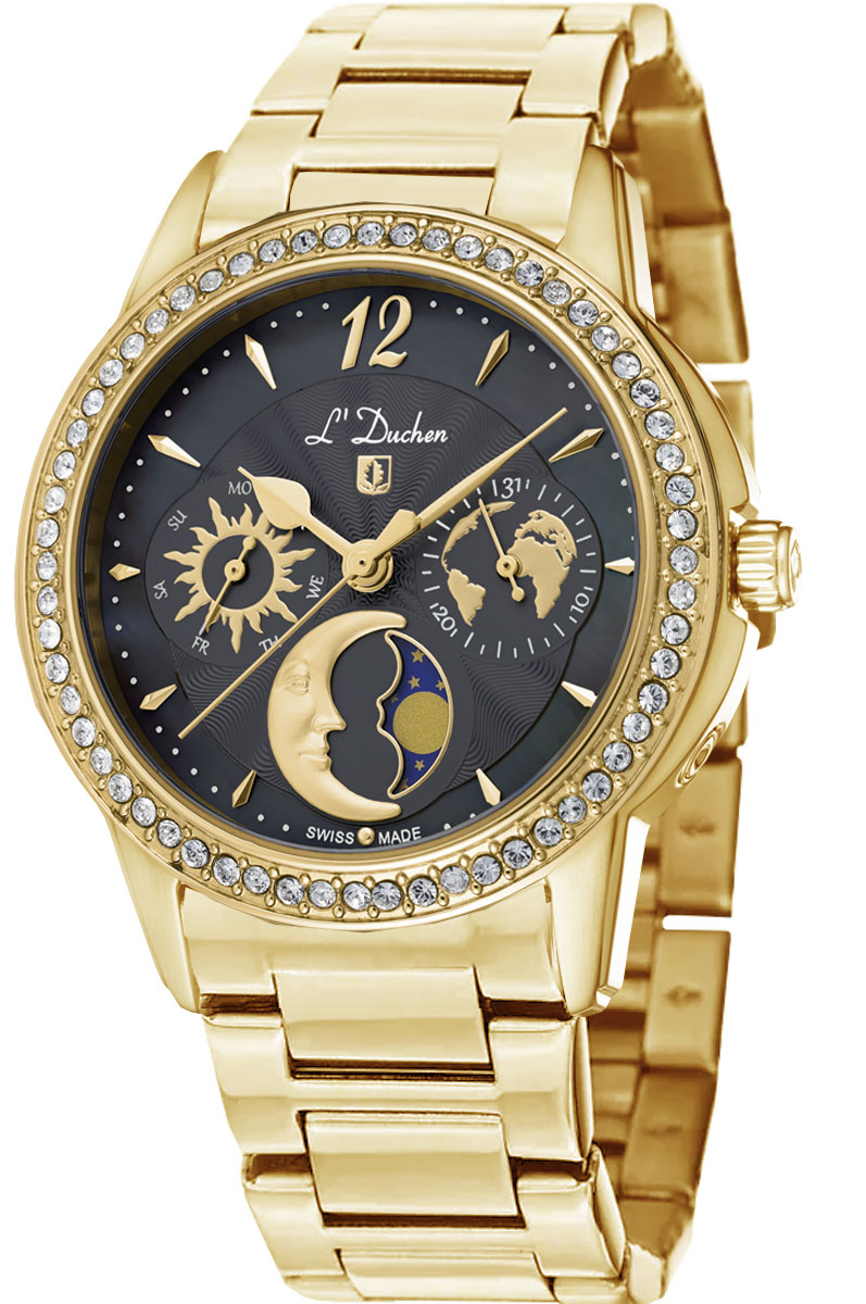 Наручные часы женские от L’Duchen- полюбившейся коллекции Celeste. На циферблате можно увидеть солнце и месяц, карту нашей планеты и кольцо из натурального перламутра. Выразительный аксессуар, дополненный необходимыми функциями, станет прекрасным продолжением стильного образа.