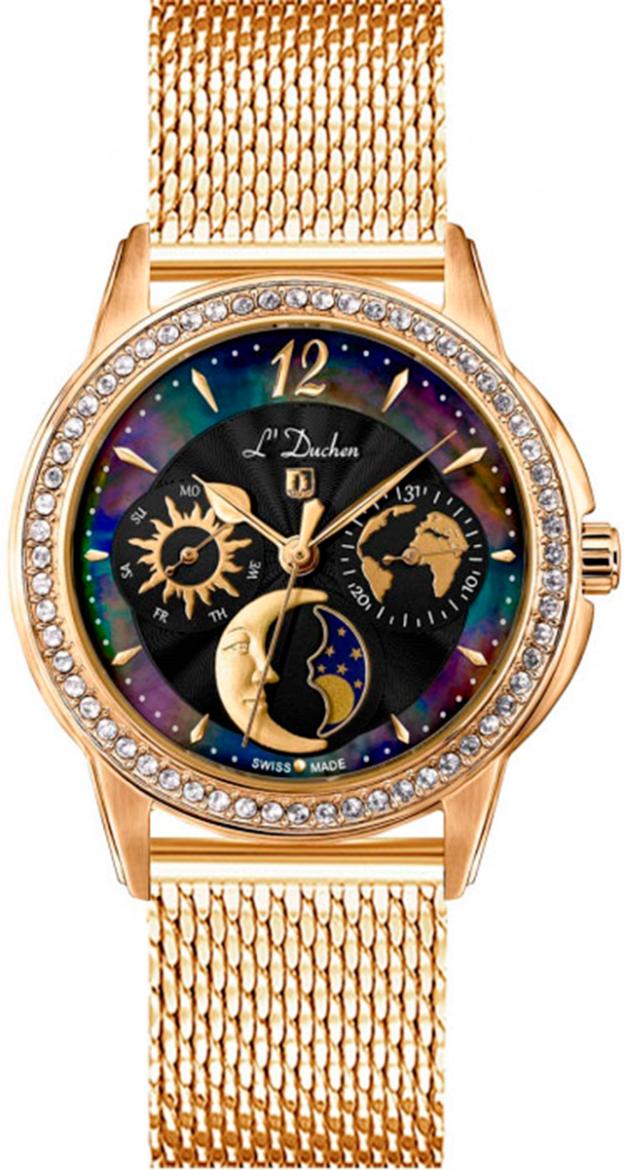 Наручные часы женские от L’Duchen- полюбившейся коллекции Celeste. На циферблате можно увидеть солнце и месяц, карту нашей планеты и кольцо из натурального перламутра. Выразительный аксессуар, дополненный необходимыми функциями, станет прекрасным продолжением стильного образа.