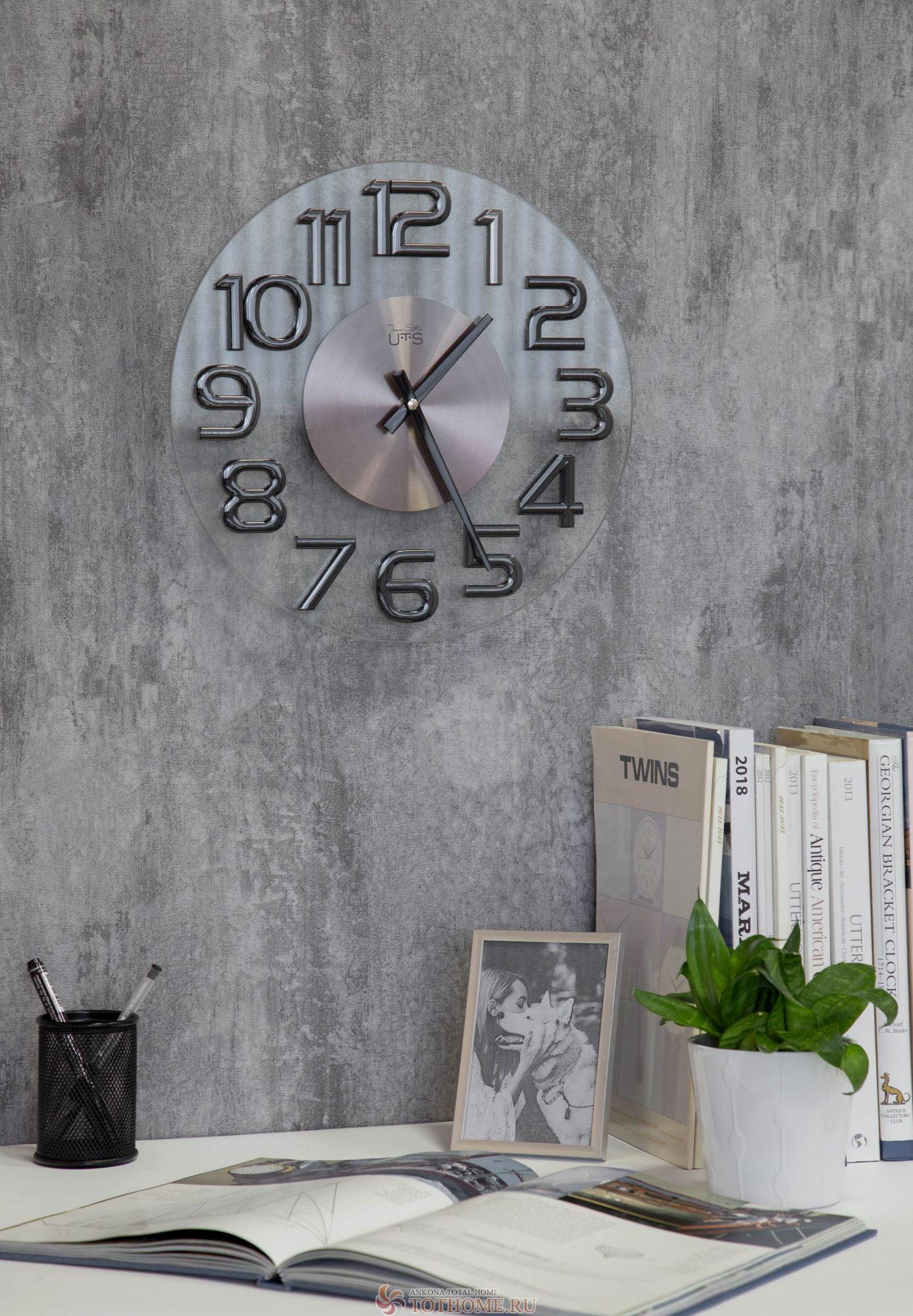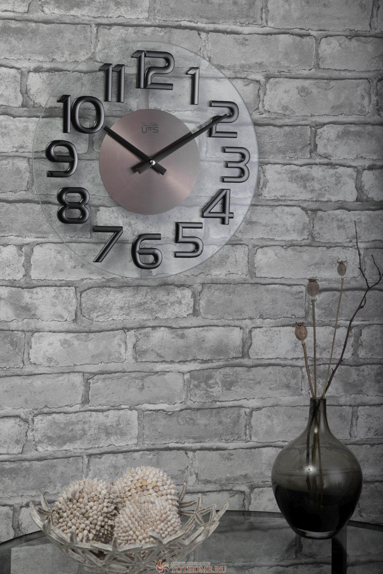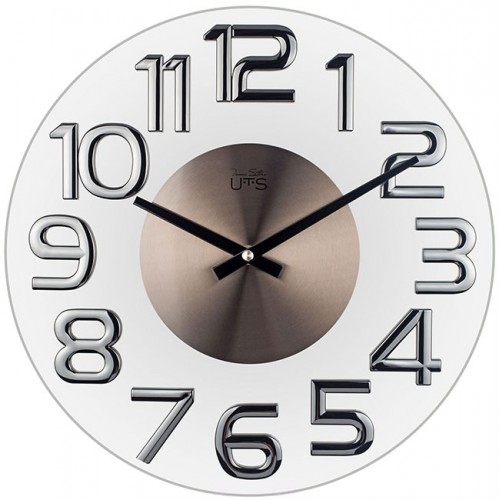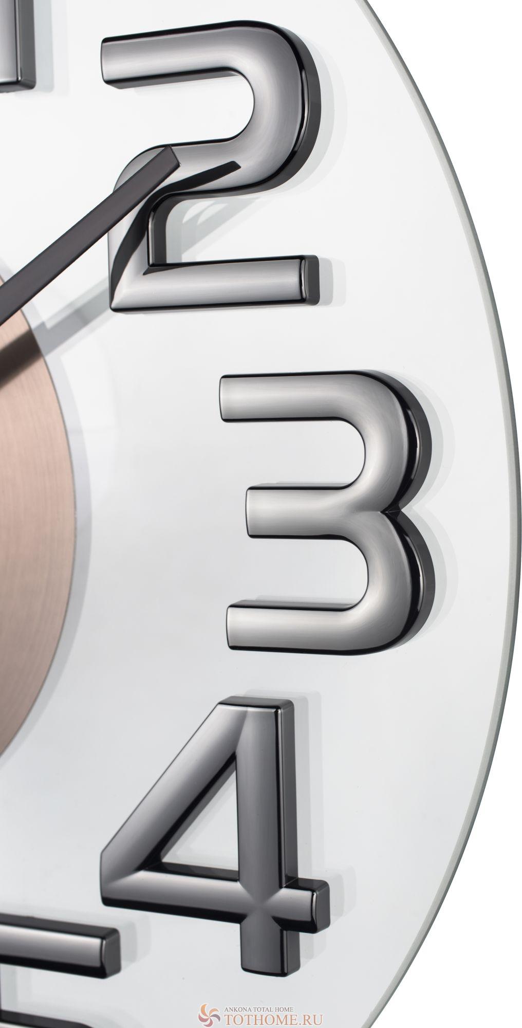 Корпус выполнен из стекла и металла. Объемные пластиковые цифры в цвете глянцевого никеля. Шлифованный металлический циферблат.