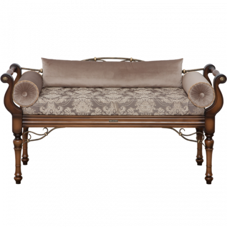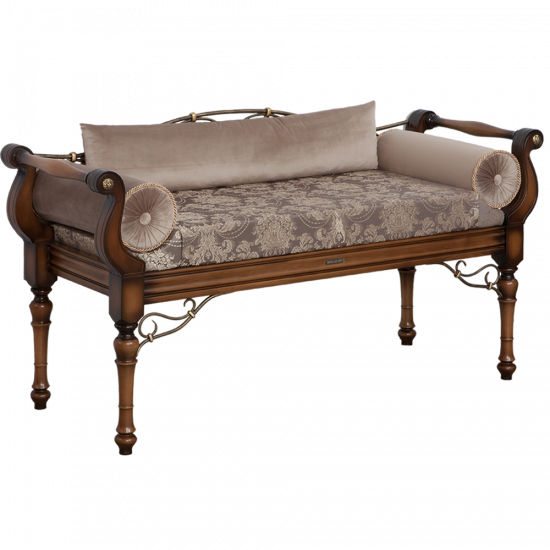 Грациозный вид изделию придают выточенные ножки, удобно выгнутые подлокотники, мягкое сиденье, подушки - валики по бокам. Каркас банкетки изготовлен из массива бука. Посадочное место, основа - мебельная фанера из берёзы.