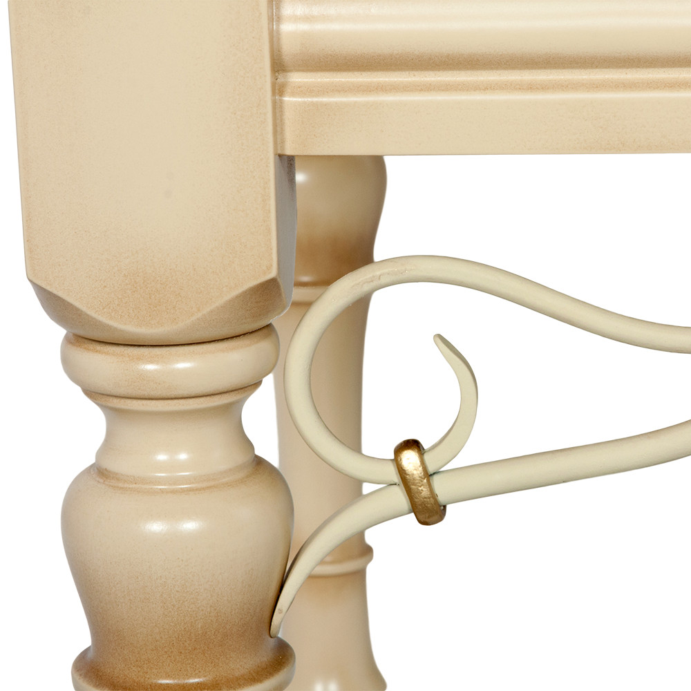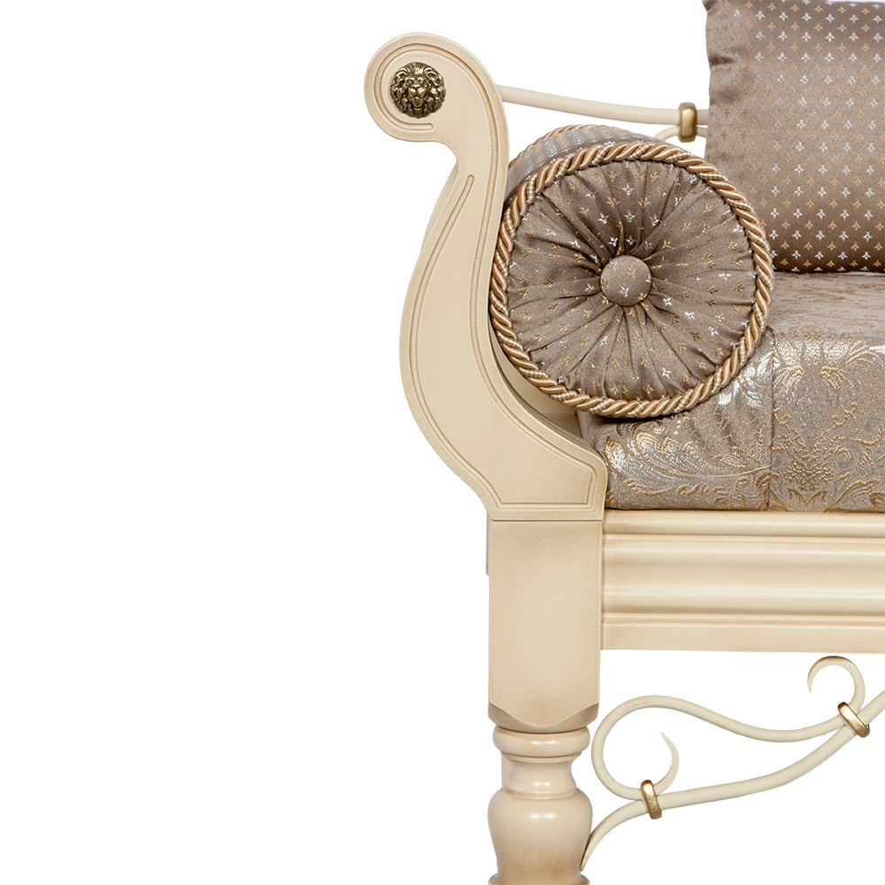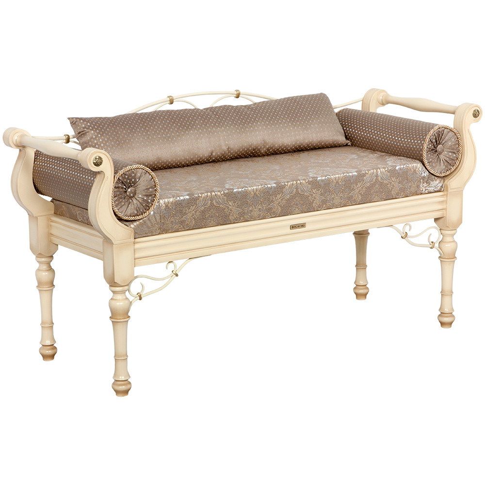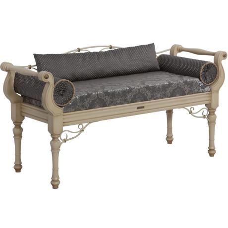 Грациозный вид изделию придают выточенные ножки, удобно выгнутые подлокотники, мягкое сиденье, подушки - валики по бокам. Каркас банкетки изготовлен из массива бука. Посадочное место, основа - мебельная фанера из берёзы.