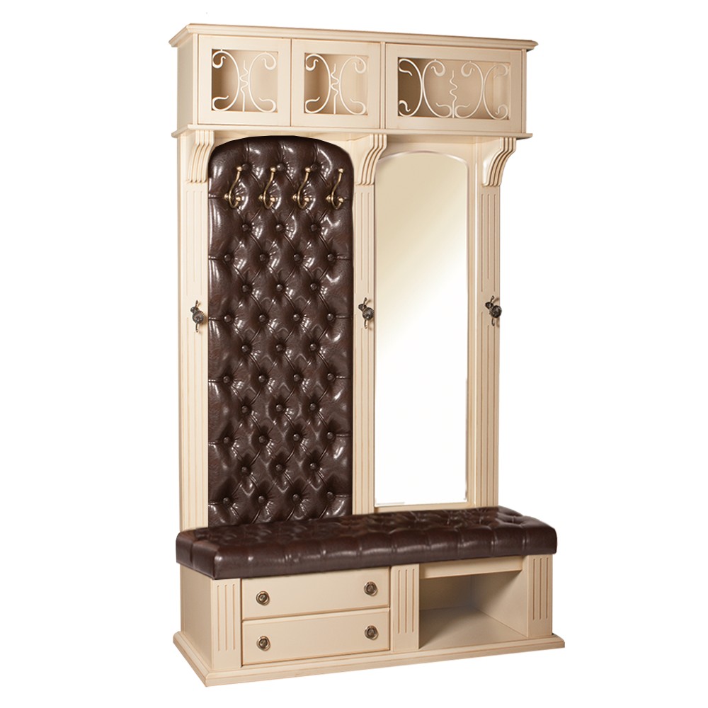 Капитель выполнена из МДФ. Ящик для вещей выполнен из МДФ. Дверцы украшены декоративной ковкой. Фурнитура из латуни испанского производства (максимальная нагрузка на крючки - 5 кг). Накладки с имитацией каннелюров выполнены из массива бука и представляют собой колонны. Зеркальное полотно из японских материалов, изготавливается в г. Москва. Крепится к стойке декоративными шурупами. Мягкий элемент на вертикальной стойки, основа - МДФ. Посадочное место, основа - мебельная фанера из берёзы, в качестве наполнителя используется пенополиуретан, отделка - кожа или искусственная кожа. Ящик для обуви выполнен из МДФ. Ниша для обуви выполнена из МДФ. Основание изготовлено из МДФ. Задняя стенка стойки - МДФ.