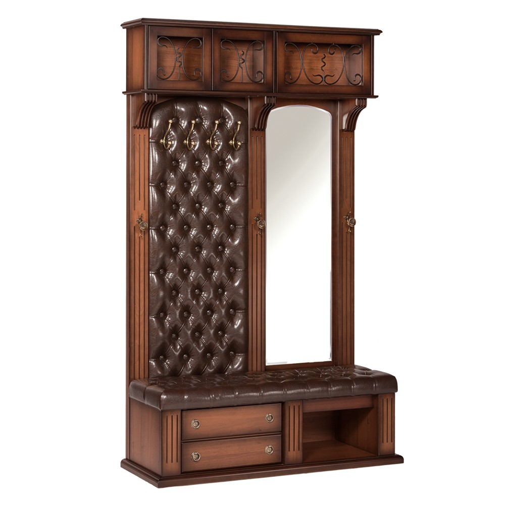 Капитель выполнена из МДФ. Ящик для вещей выполнен из МДФ. Дверцы украшены декоративной ковкой. Фурнитура из латуни испанского производства (максимальная нагрузка на крючки - 5 кг). Накладки с имитацией каннелюров выполнены из массива бука и представляют собой колонны. Зеркальное полотно из японских материалов, изготавливается в г. Москва. Крепится к стойке декоративными шурупами. Мягкий элемент на вертикальной стойки, основа - МДФ. Посадочное место, основа - мебельная фанера из берёзы, в качестве наполнителя используется пенополиуретан, отделка - кожа или искусственная кожа. Ящик для обуви выполнен из МДФ. Ниша для обуви выполнена из МДФ. Основание изготовлено из МДФ. Задняя стенка стойки - МДФ.