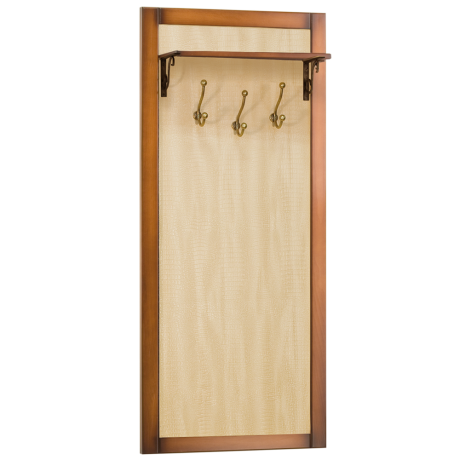 Каркас вешалки выполнен из МДФ. Полка – материал МДФ, крепление выполнено в виде кованых элементов. Максимальная нагрузка 10 кг. Фурнитура вешалки выполнена из латуни Испанского производства (максимальная нагрузка крючков 5 кг.). Накладки выполнены из массива бука. Каркас прихожей, обтянут искусственной кожей.