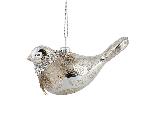 Елочная игрушка ИТАЛИЯ 22243 Птичка с перьями серебряный
