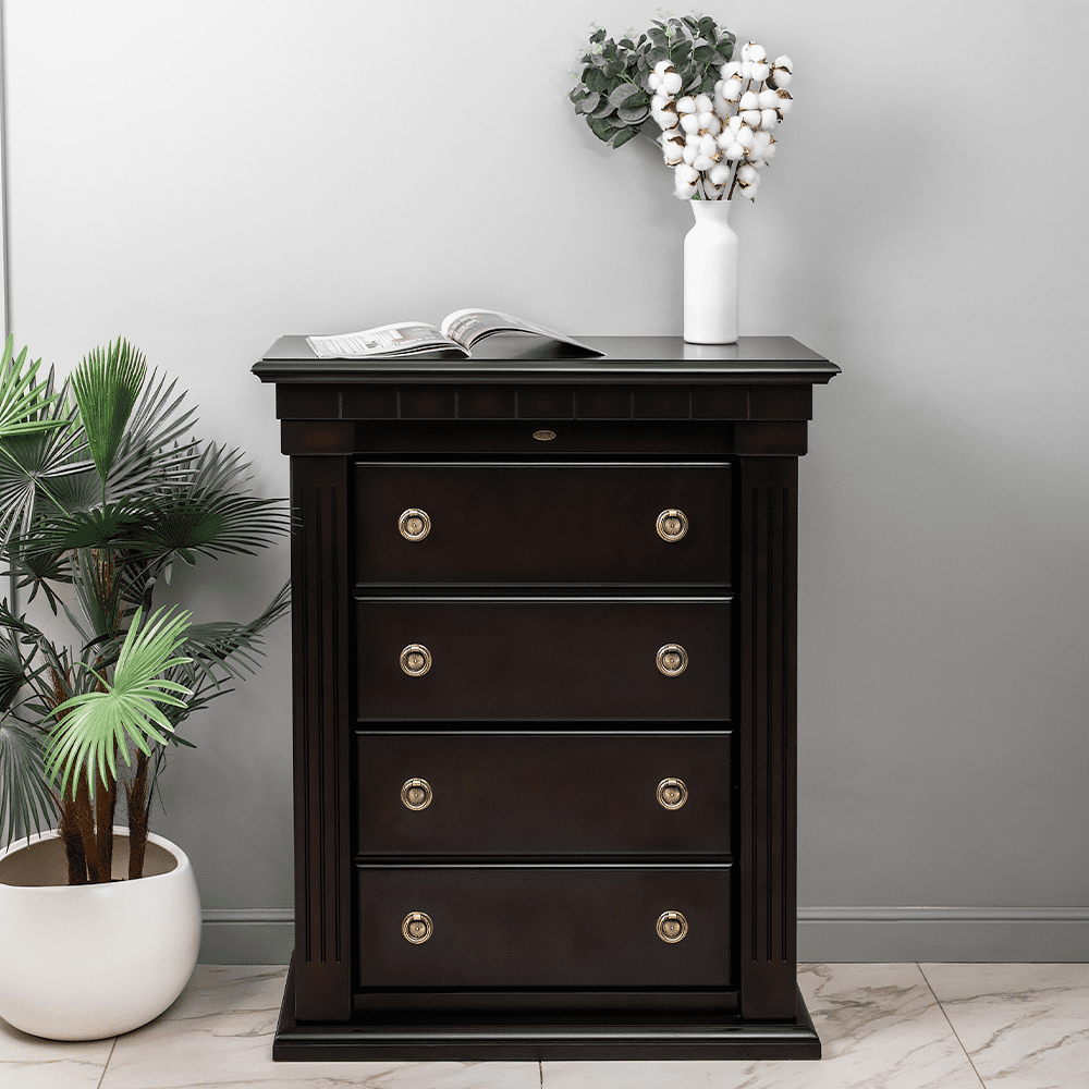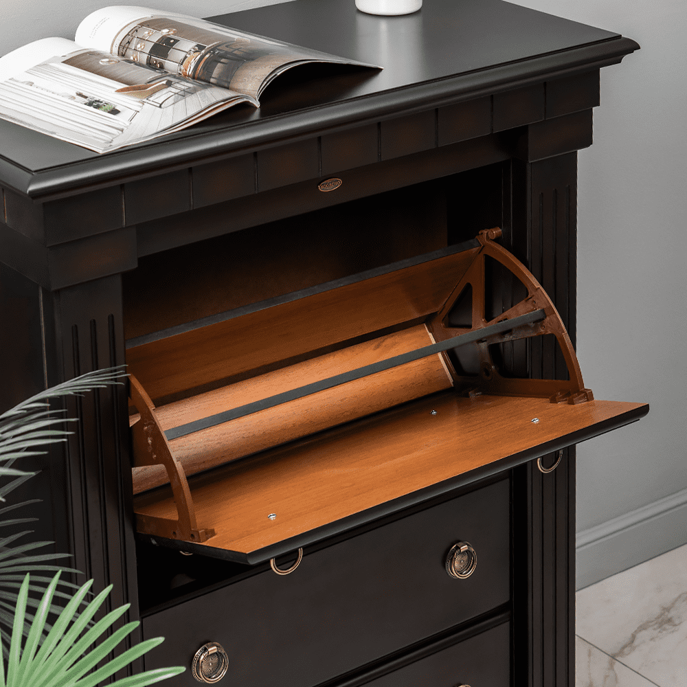 Капитель выполнена из МДФ. Фурнитура из латуни испанского производства. Накладки с имитацией каннелюров выполнены из массива бука и преставляют собой колонны. Каркас и основание изготовлено из МДФ.