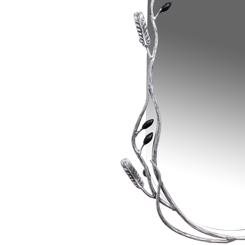Зеркальное полотно закреплено на металлической раме из легированной стали. Декоративные элементы отшлифованы и патинированы вручную.