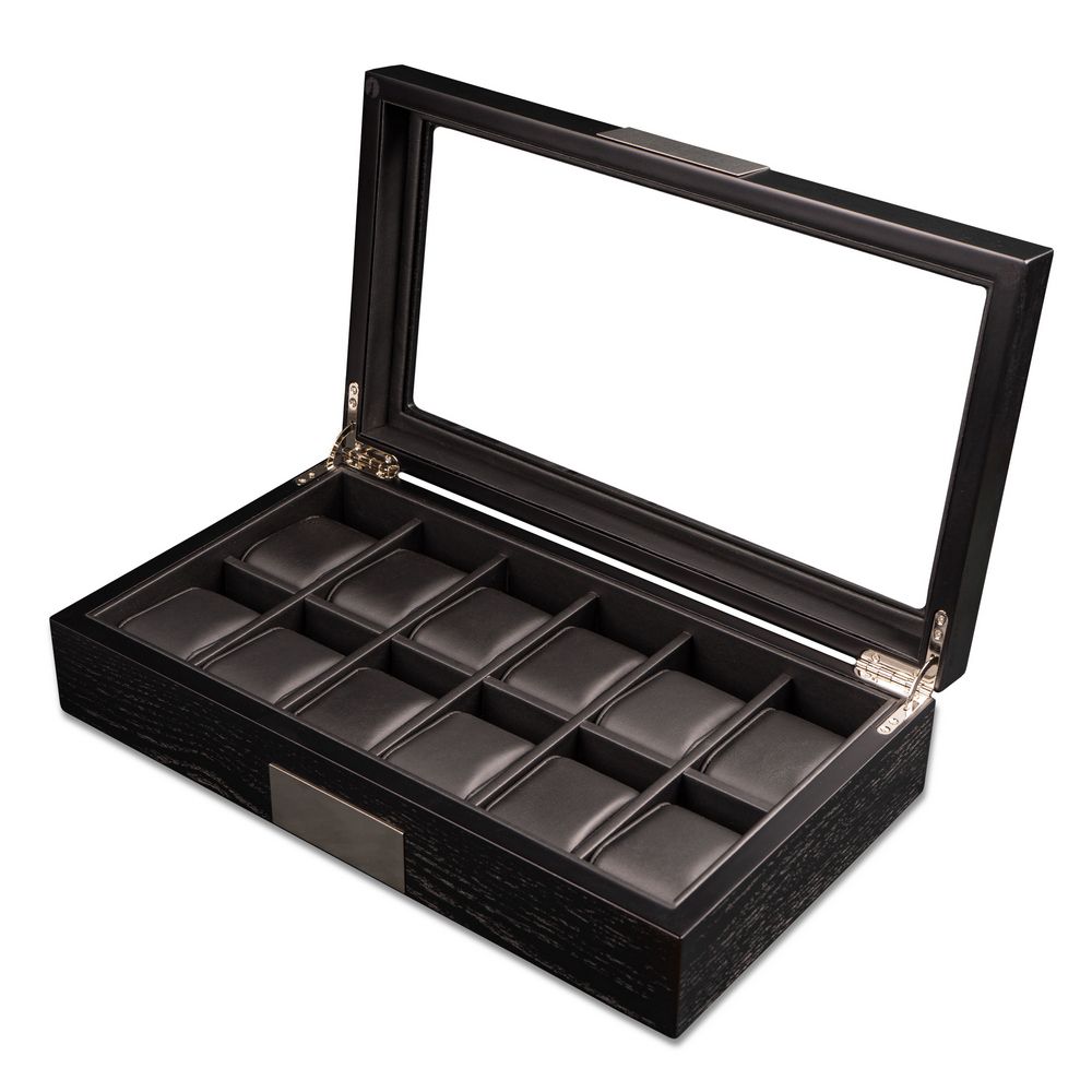 Для ценителей своих наручных аксессуаров мы расположили прозрачное стекло посередине крышки, через которое можно созерцать коллекцию из 12-ти часов. Исполнение экстерьера в черном дереве Бубинга является редкостью, а покрытие множественными слоями высококачественного лака придает изящность.