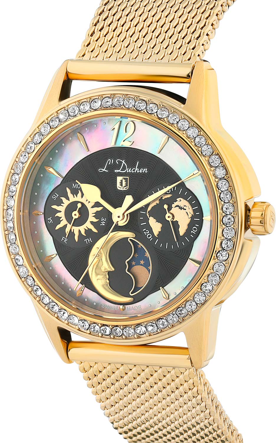 Наручные часы женские от L’Duchen- полюбившейся коллекции Celeste. На циферблате можно увидеть солнце и месяц, карту нашей планеты и кольцо из натурального перламутра. Выразительный аксессуар, дополненный необходимыми функциями, станет прекрасным продолжением стильного образа.