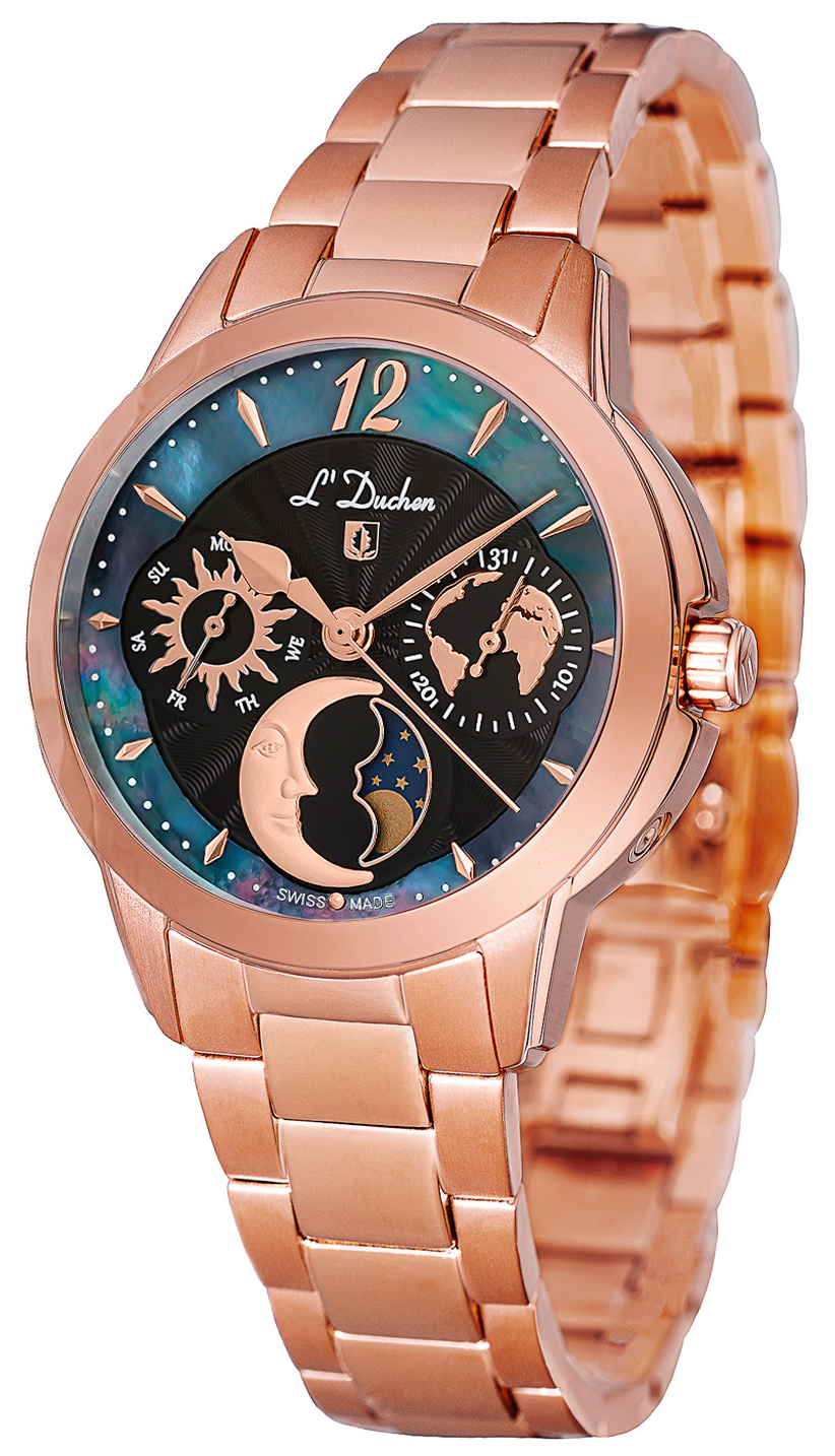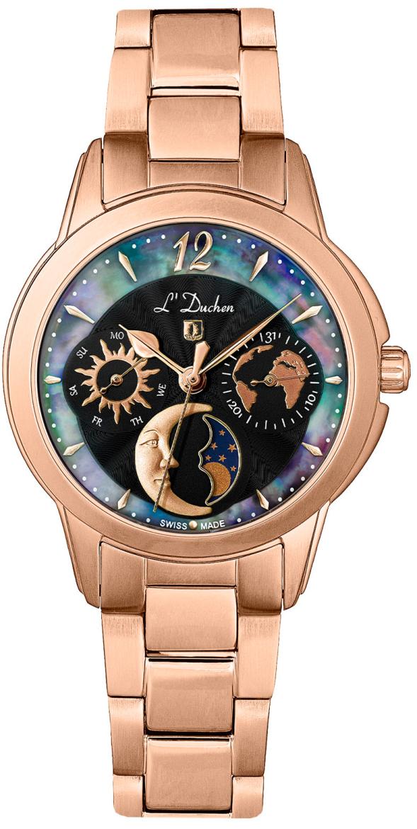 Наручные часы женские от L’Duchen- полюбившейся коллекции Celeste. На циферблате можно увидеть солнце и месяц, карту нашей планеты и кольцо из натурального перламутра. Выразительный аксессуар, дополненный необходимыми функциями, станет прекрасным продолжением стильного образа.
