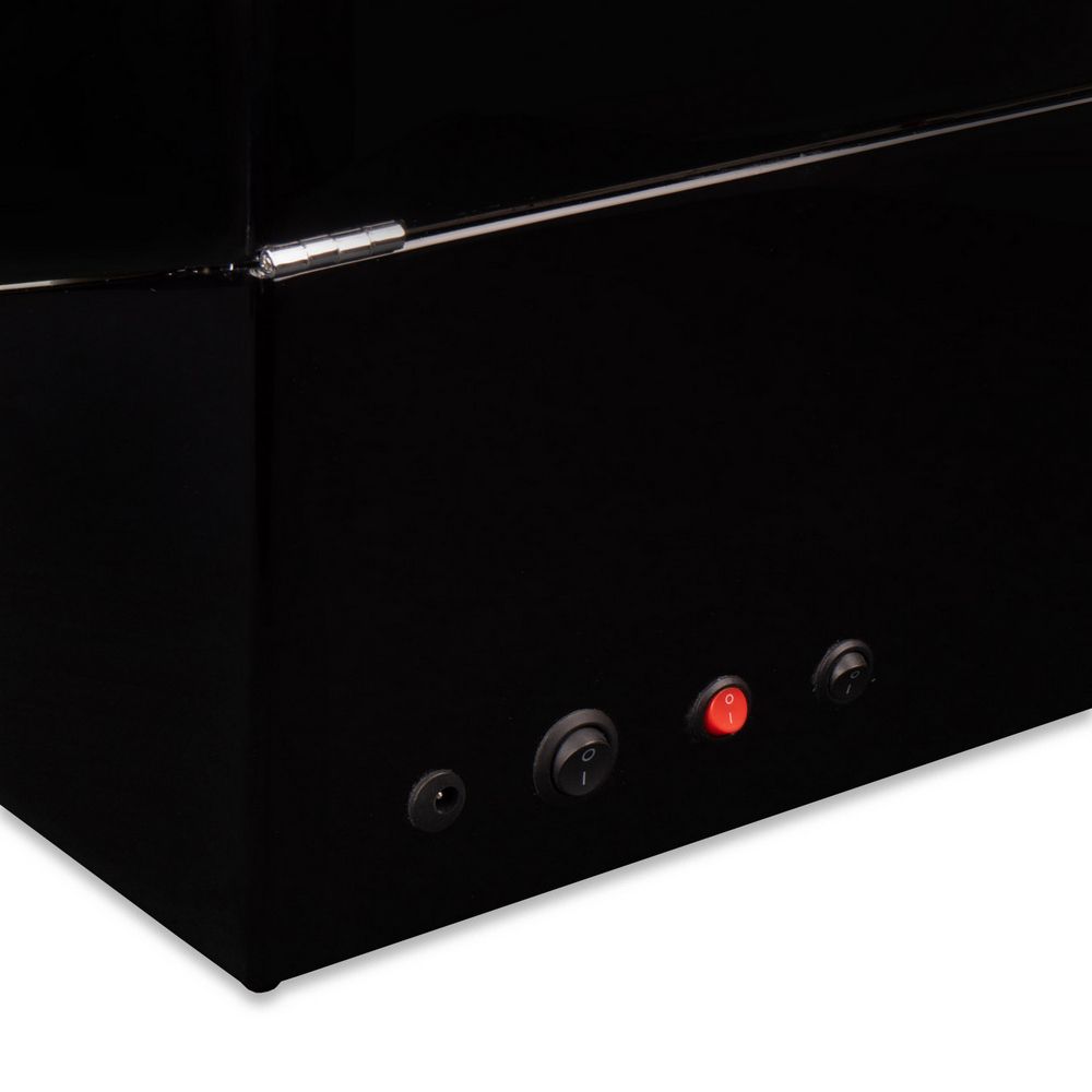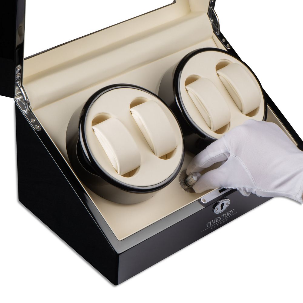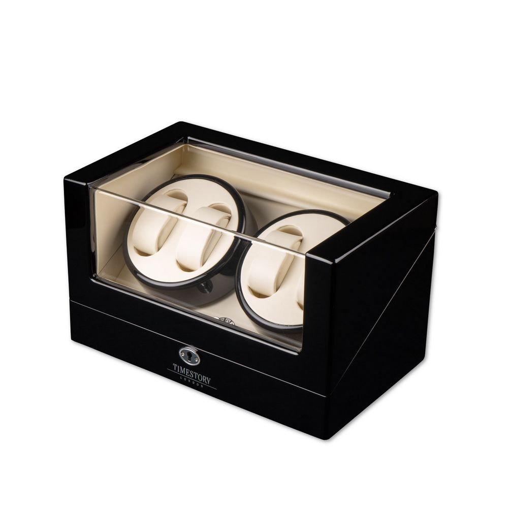 В экстерьере используется дерево, покрытое множественными слоями высококачественного глянцевого лака черного цвета. Для максимальной простоты в использовании автоподзавод включается всего с одной кнопки на задней стороне бокса. Истинные ценители часов оценят четыре режима подзавода в шкатулке, управляемые на торцевой части рядом с крутящимся кольцом. Продуманная система выбора режимов вращения сможет завести любые часы любой сложности. Достаточно просто повернуть тумблер на нужный режим, и часы будут автоматически подзаводиться. Для ночной видимости часов, в шкатулке встроена приятная светло-синяя светодиодная подсветка под кольцом подзавода, включающаяся с кнопки на задней стороне.