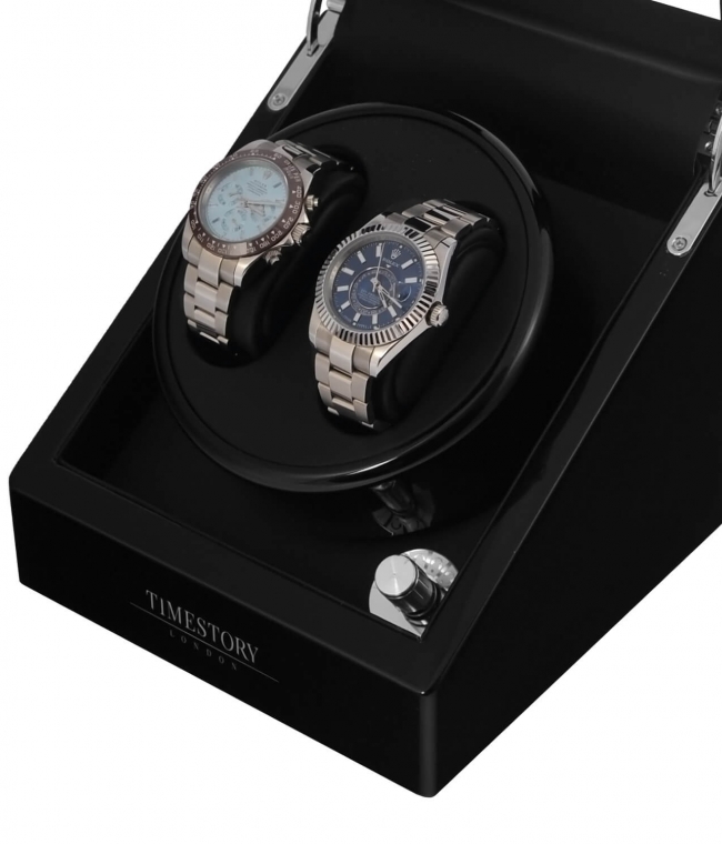 В экстерьере используется черное дерево, покрытое множественными слоями высококачественного глянцевого лака. Для максимальной простоты в использовании автоподзавод включается всего с одной кнопки на задней стороне бокса. Истинные ценители часов оценят четыре режима подзавода в шкатулке, управляемые на торцевой части рядом с крутящимся кольцом. Продуманная система выбора режимов вращения сможет завести любые часы любой сложности. Достаточно просто повернуть тумблер на нужный режим, и часы будут автоматически подзаводиться. Для ночной видимости часов, в шкатулке встроена приятная светло-синяя светодиодная подсветка под кольцом подзавода, включающаяся с кнопки на задней стороне.