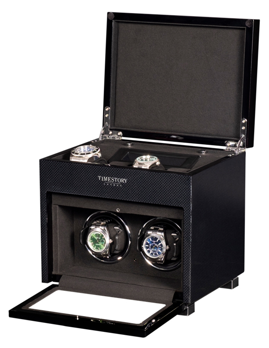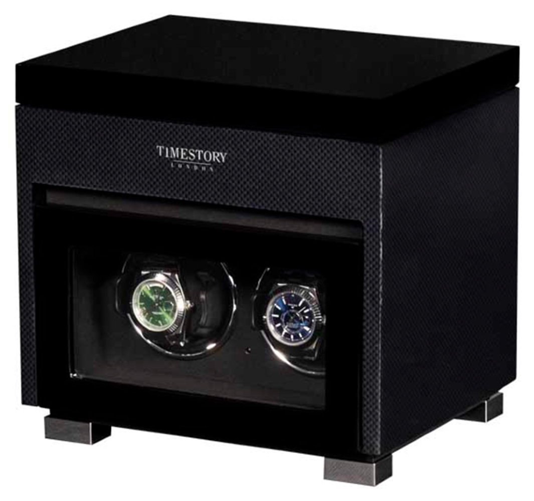 В экстерьере используется высококачественный карбон, покрытый большим количеством слоев глянцевого лака.Профессиональная система выбора режимов вращения сможет завести любые часы любой сложности. Достаточно просто на сенсорном экране подобрать нужное количество оборотов (от 300 до 2300), выбрать подходящее вращение (по часовой / против часовой стрелки или попеременное вращение) . Использование мягкой ткани черного оттенка в интерьере не оставит вас равнодушными. Телескопические держатели позволят с максимальным комфортом и удобством застегнуть на них часы с любой длиной ремешка или браслета.